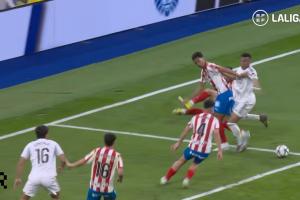 首先来到马德里,圣地亚哥・伯纳乌球场,赫罗纳禁区内出现一次极具争议的攻防。皇马进攻球员完成变向摆脱后,在禁区内与赫罗纳防守球员发生身体对抗,皇马球员试图继续持球向球门推进。此时双方球员产生肢体接触:一方面防守球员手臂碰到了前锋面部,另一方面几乎同时,防守方又碰到了进攻球员的支撑腿。所有接触均源于此次对抗本身的动态与惯性,最终导致进攻球员倒地。主裁站位合理、视线清晰,判定比赛继续进行。