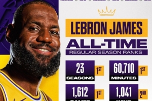 体育资讯3月23日讯 今天,NBA官方晒出詹姆斯一系列的常规赛数据。具体如下: